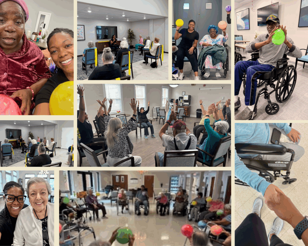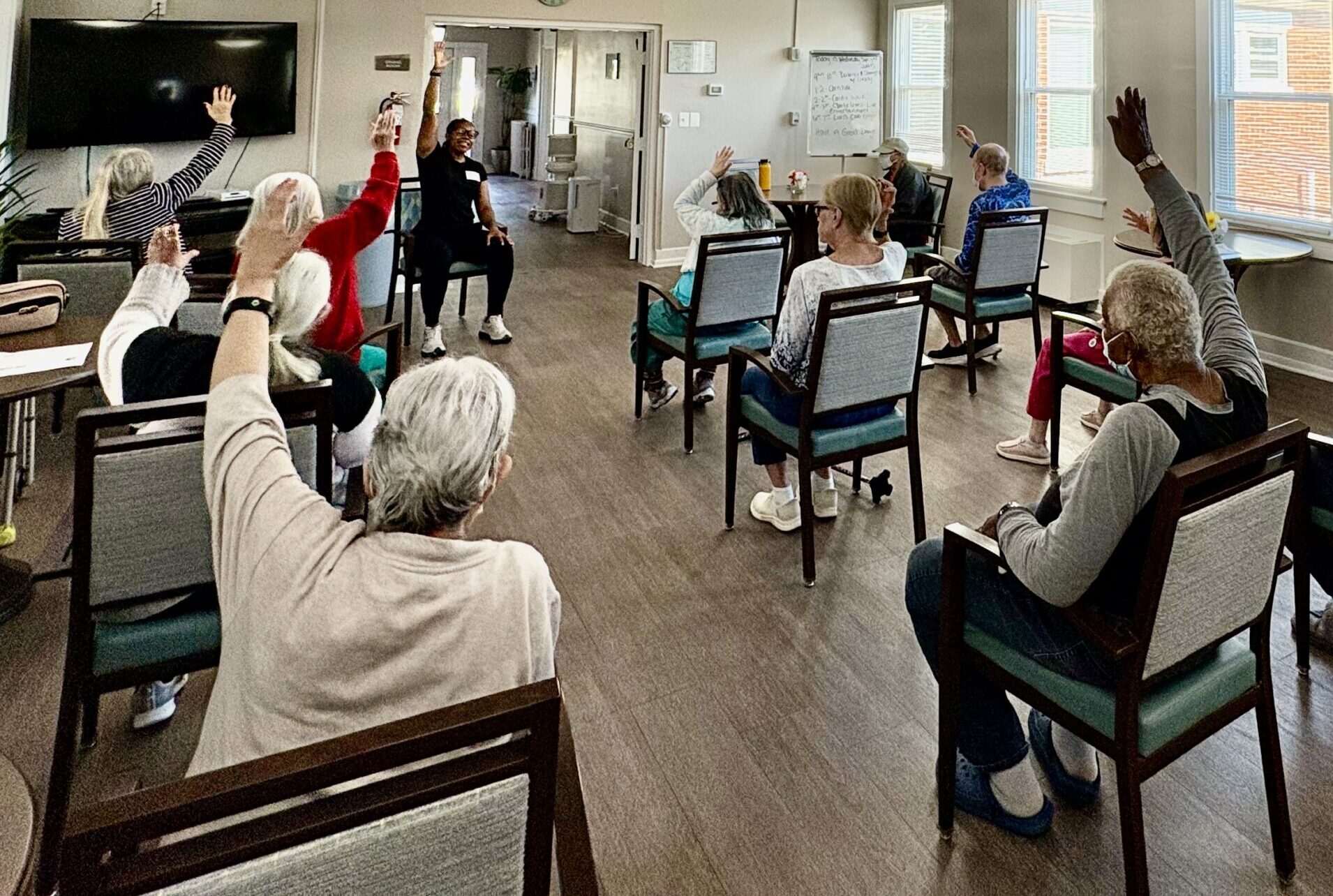 There is always something for everyone. Every single class includes a blend of the following: improving circulation, maintaining joint mobility, supporting posture, encouraging relaxation, building strength, enhancing balance – all while enjoying movement in a safe environment with fellow residents (sometimes even the nurses and care staff attend!)